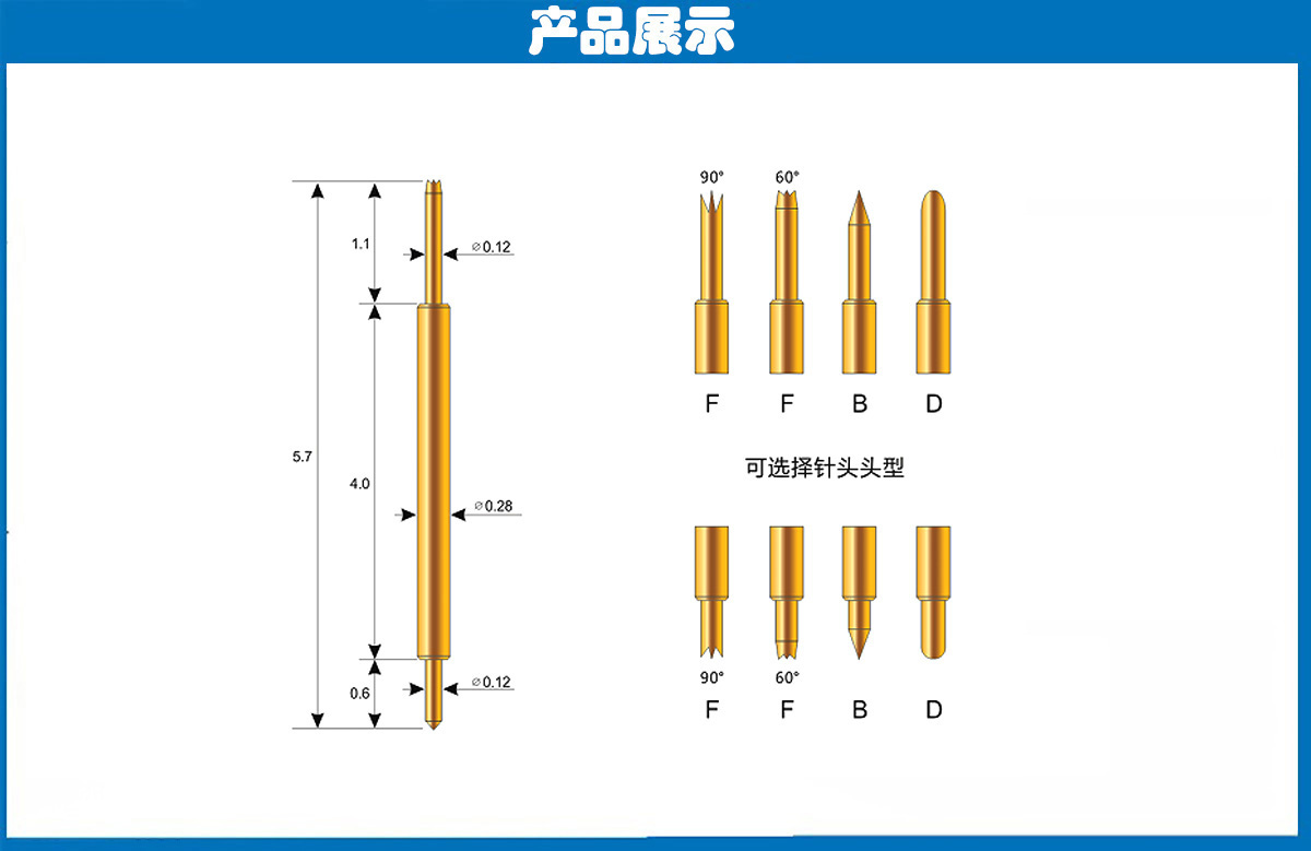 產(chǎn)品頭型:探針外徑為0.28mm,總長度為5.7mm、針的兩端的頭型為尖頭、爪頭