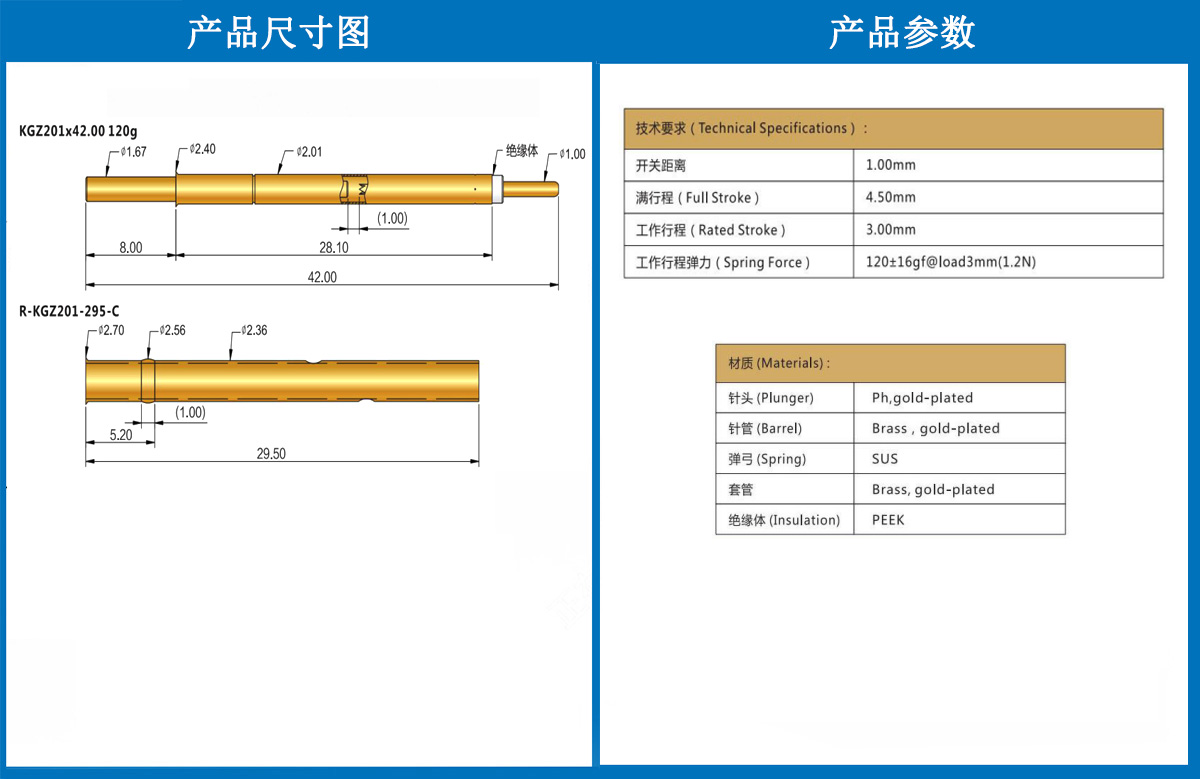 產(chǎn)品簡介:KGZ201探針,2.01mm測試針、總長42mm、彈簧針、測試針